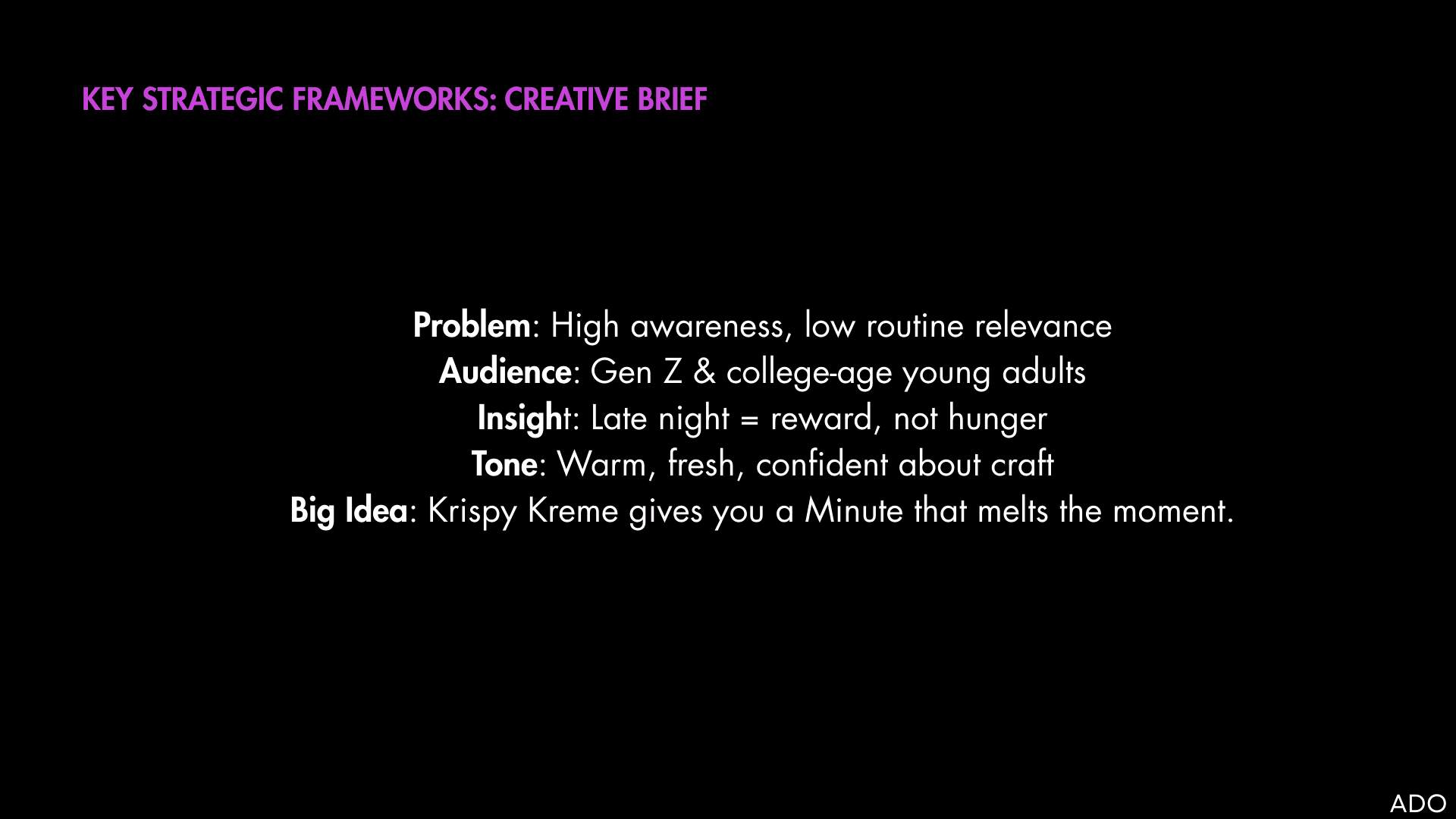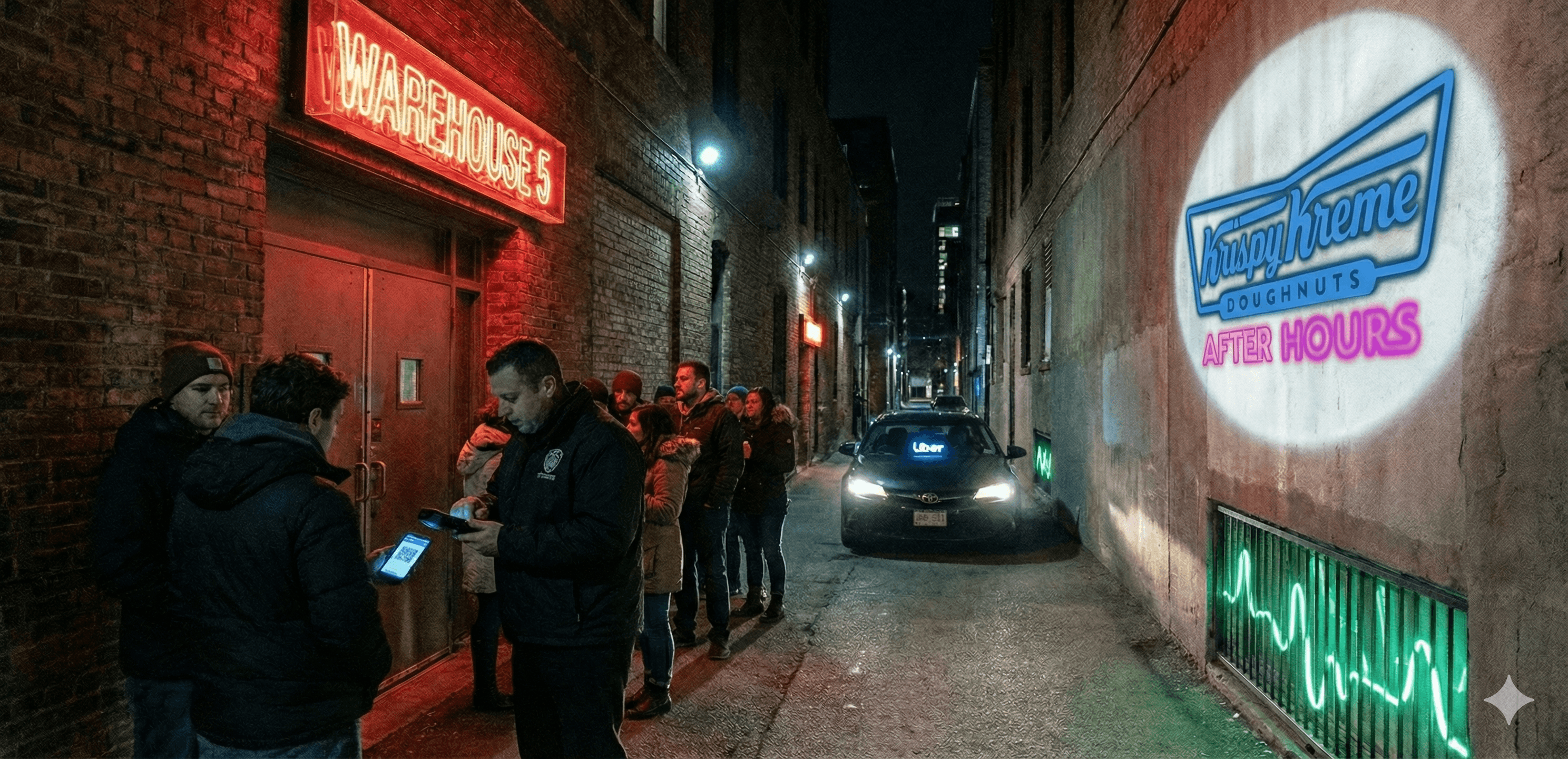 Krispy Kreme is iconic, nostalgic, and emotionally resonant—but largely perceived as a daytime or “special occasion” indulgence. After-hours moments (late nights, post-event cravings, decompression time) were culturally rich but underleveraged.